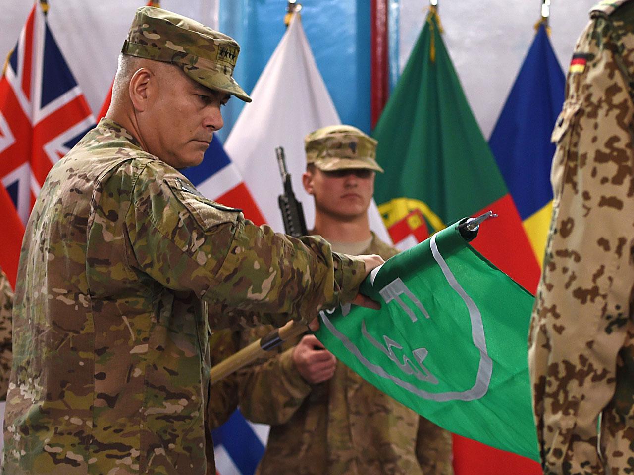 Gen. John Campbell, commander of ISAF, rolled up and sheathed the green and white ISAF flag and unfurled the flag of the new international mission, called Resolute Support.